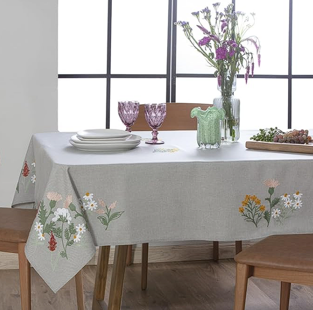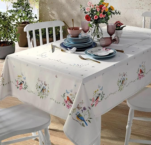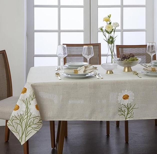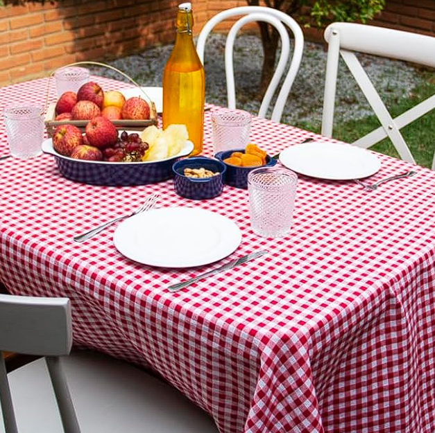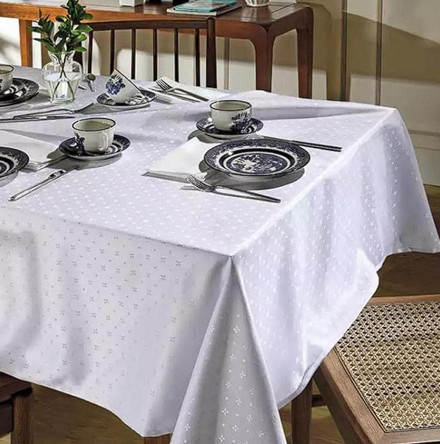 É uma toalha para uma mesa de 6 lugares que possui 140x210cm de medida. Possui em sua composição 50% algodão e 50% poliéster;